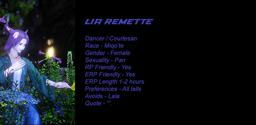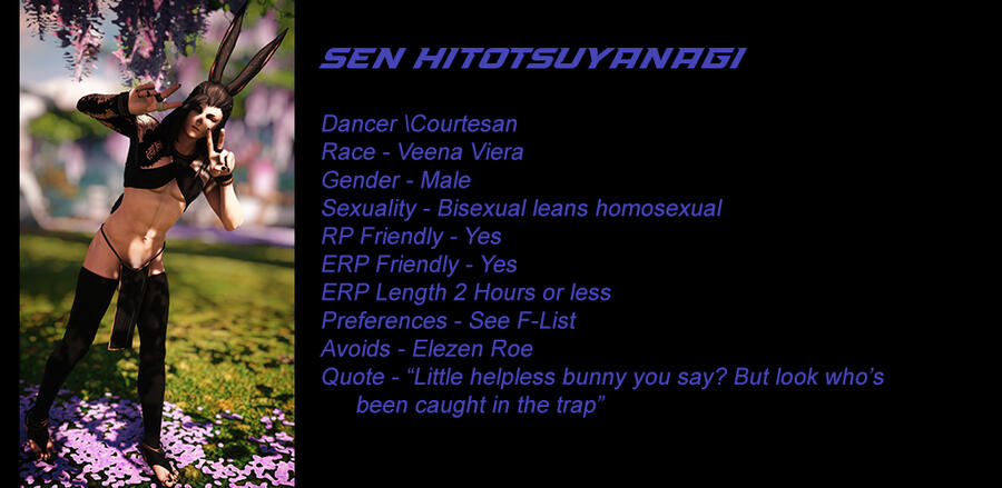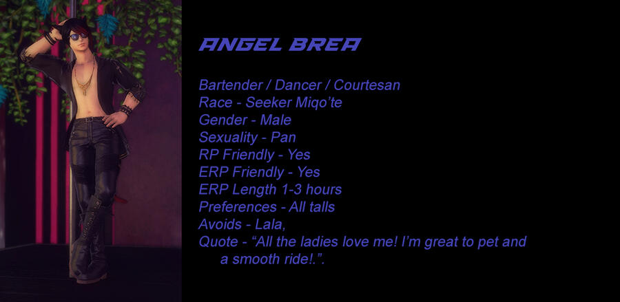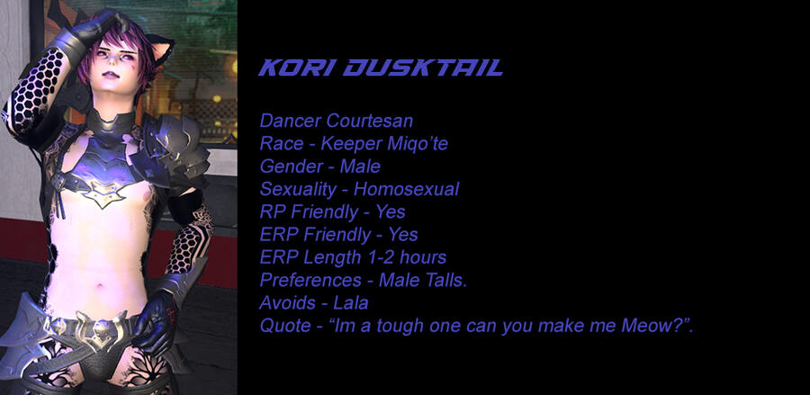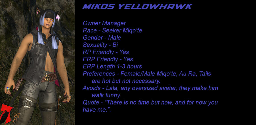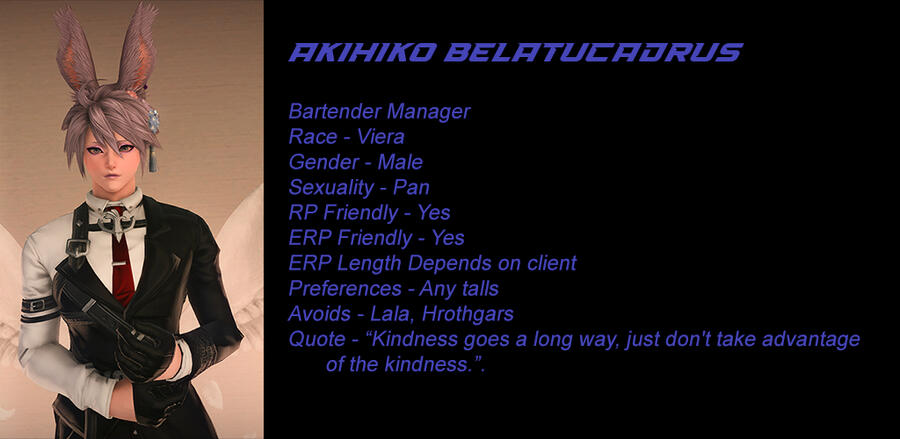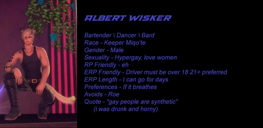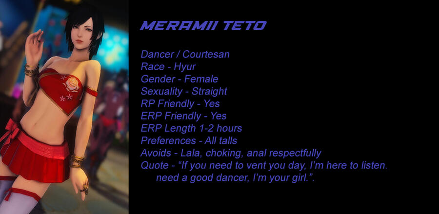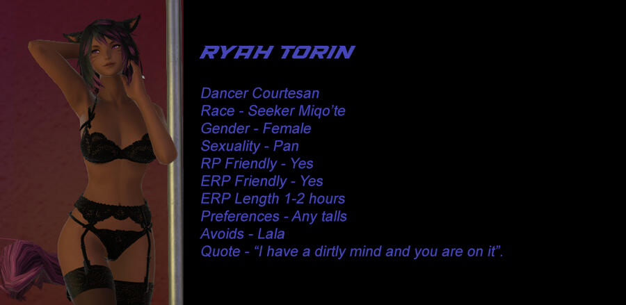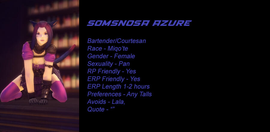 The staff of Void Cats is ready to fulfill your desires. Bartenders will make and serve drinks. Dj's and bard bands will provide music entertainment.If you want some private time with any of our delightful dancers/courtesans they are available for you to enjoy. All staff members will be marked.Yellow "Melding Materia" icons indicate RP services. Green "Looking for Party" icons indicate they are willing to provide a more intimate experience in one of 4 venue provided private rooms. Off site services are also available.Please see a manager to arrange private ERP services with available staff.
